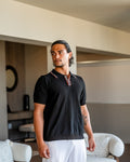 A contemporary take on the classic polo, crafted from a soft viscose-polyester blend for breathability and structure. The subtle herringbone texture adds depth, while contrast piping at the collar and placket offers a refined touch. Tailored for a sleek silhouette, perfect for both casual and elevated styling.